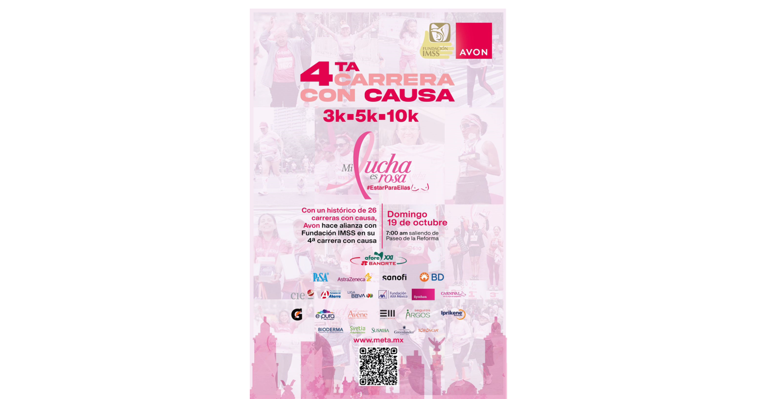 El próximo 19 de octubre, el Paseo de la Reforma se pintará de rosa con la 4° edición de la Carrera con Causa “Mi lucha es rosa”, un evento deportivo y solidario en el que, por primera vez, Fundación IMSS, Avon y la Fundación Instituto Natura se unen para fortalecer la detección oportuna del cáncer de mama en México.