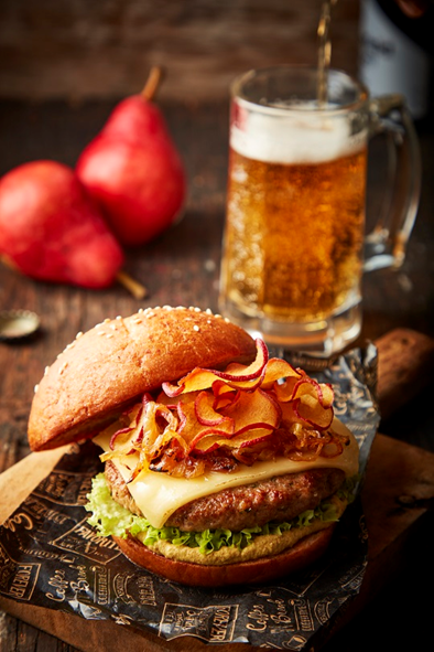 Tueste los panes; unte la base de cada uno con un poco de mostaza, agregue lechuga, la carne, una cucharada de cebolla caramelizada y chips de pera.