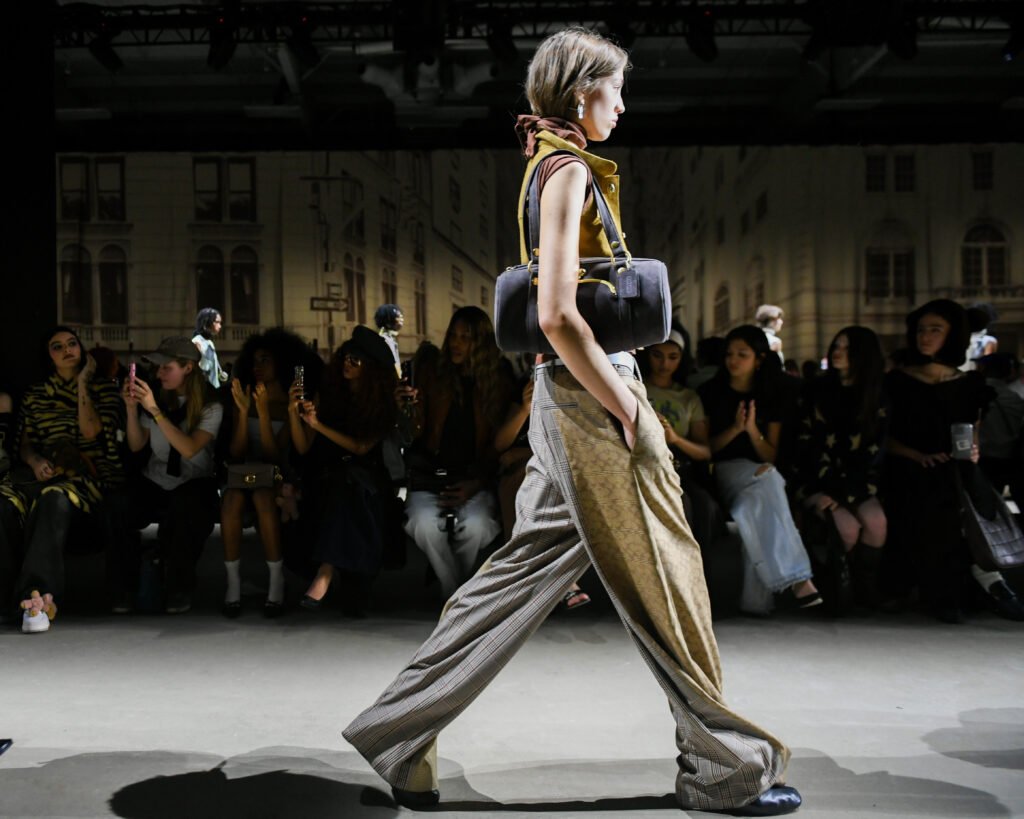 Los invitados fueron guiados a través de un espacio obscuro hasta llegar al área principal, rodeada por completo de lonas en sepia que representaban las grandes fachadas y amplias vistas de Nueva York. Bañado en luz y sombras marcadas, el escenario enmarcaba a los modelos como si caminaran por las calles de la ciudad, parte de un desfile continuo de la vida urbana.