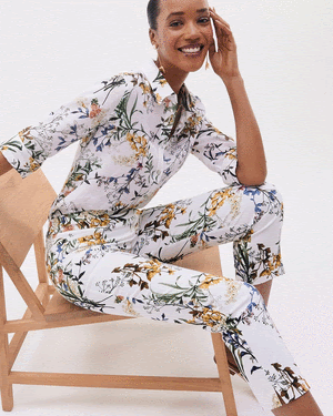 Si prefieres un look más casual, puedes optar por pantalones informales, jeans o capri como sus Brigitte Floral Slim Cropped Pants combinados con una blusa elegante, como la Floral Eyelet Shirt elaborada con algodón ligero.