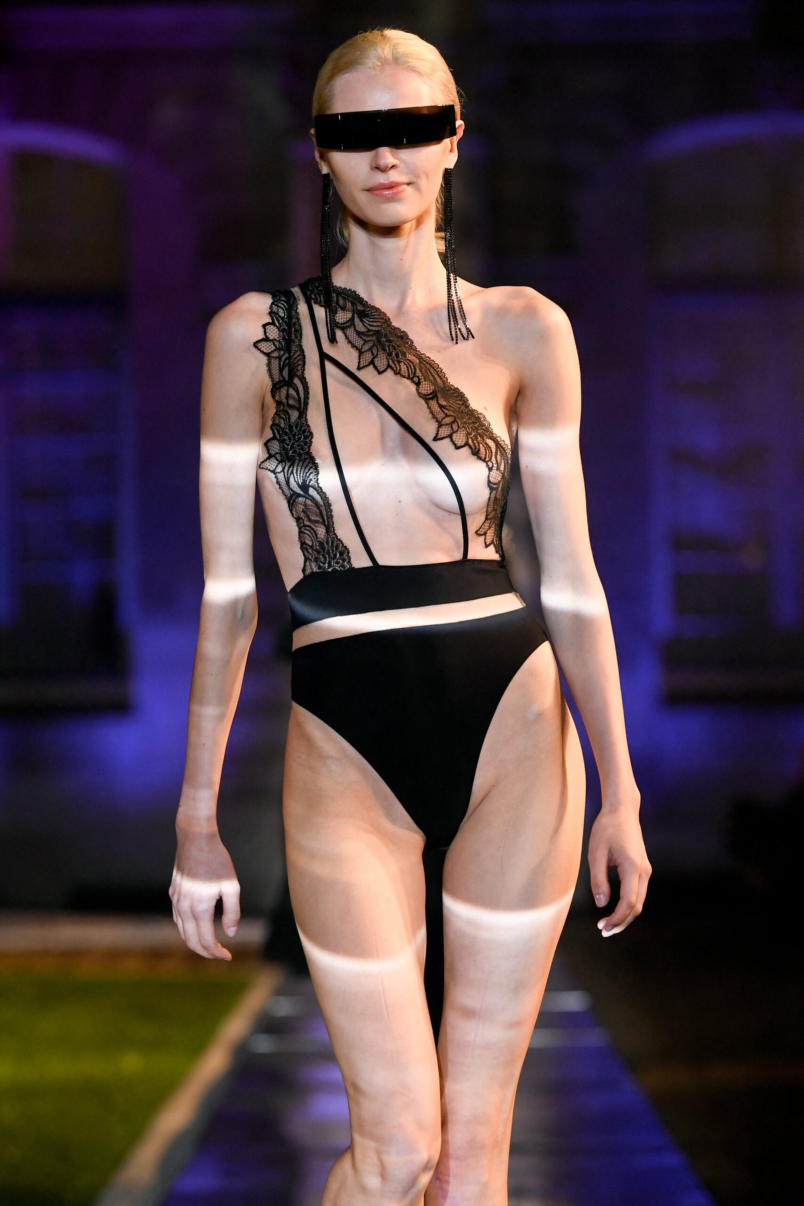 Cambio de atmósfera, la luna se oscurece. Tommy Genesis hace su entrada en «A woman is God». Las siluetas revelan la pluralidad de un negro intenso. Las líneas son estrictas y suntuosas, esculpen un cuerpo en movimiento. Inesperados y sorprendentes, los bodys y bustiers revelan nuevas construcciones. Las curvas se redefinen y siempre se subliman. Asimetría, hombros amplificados y fino encaje: opera un juego de contrastes y transparencias. Un cuadro arquitectónico que hace retroceder los códigos establecidos de la lencería tradicional, ofreciendo una visión que es a la vez y visión futurista.