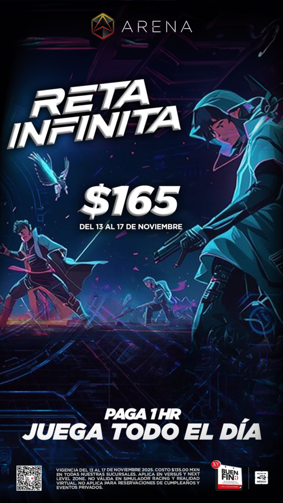 Y para un día lleno de adrenalina con tus videojuegos favoritos, en todas las sucursales de Arena The Place to Play, llega exclusivamente del 13 al 17 de noviembre, la promoción Reta Infinita con la que podrás pagar 1 hora y jugar todo el día por solo $165 (en áreas Versus y Next Level Zone) ¡no te lo puedes perder!