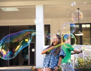 FitbitAce3LifestyleCosmicBlueBlackBackyardFamilyBubbles03788_Cropped