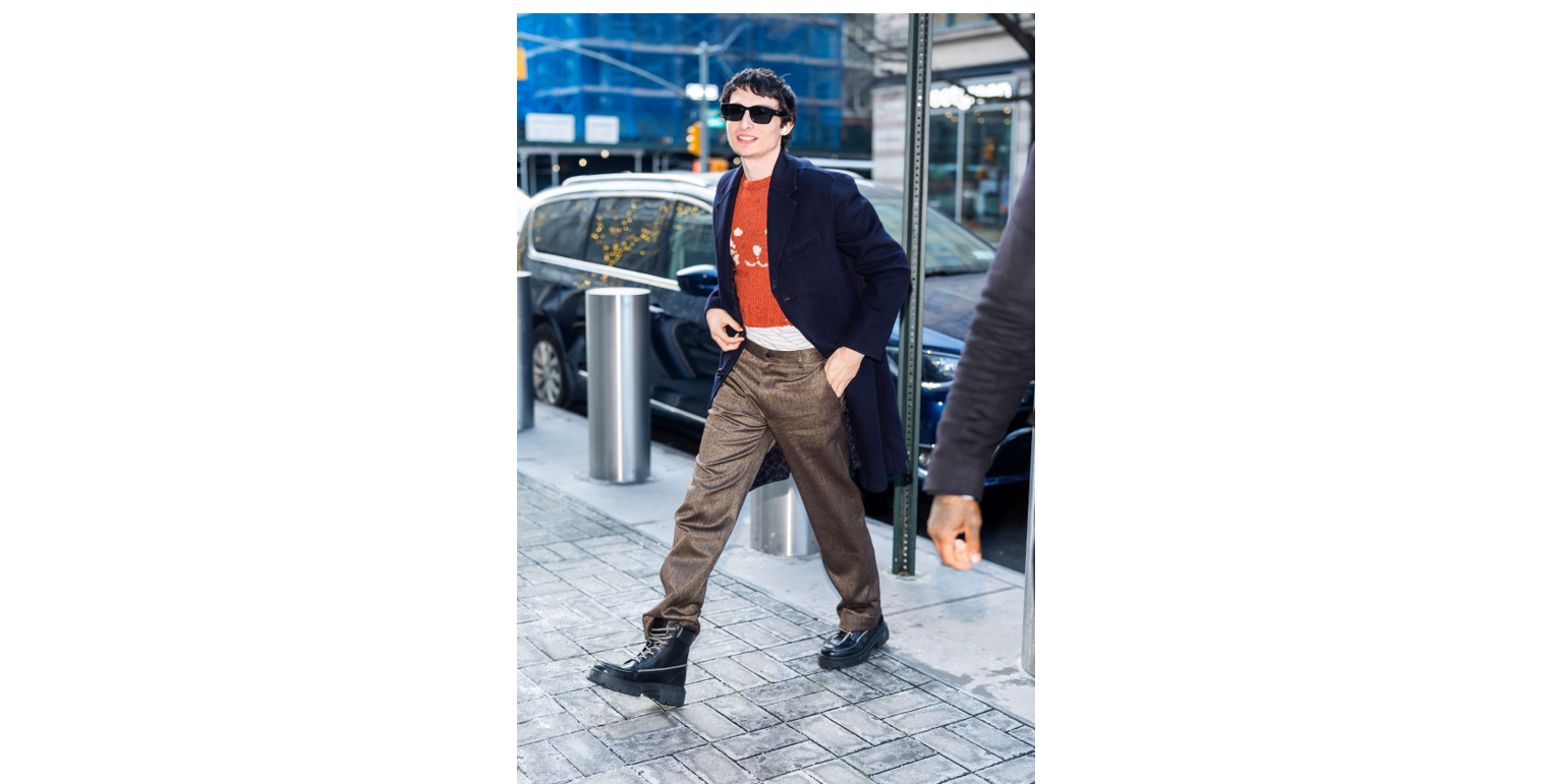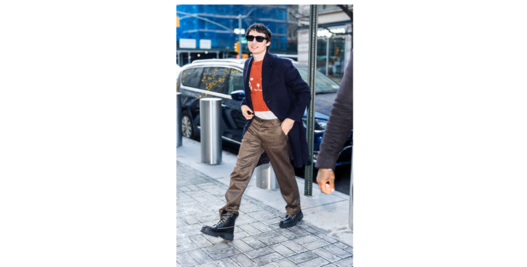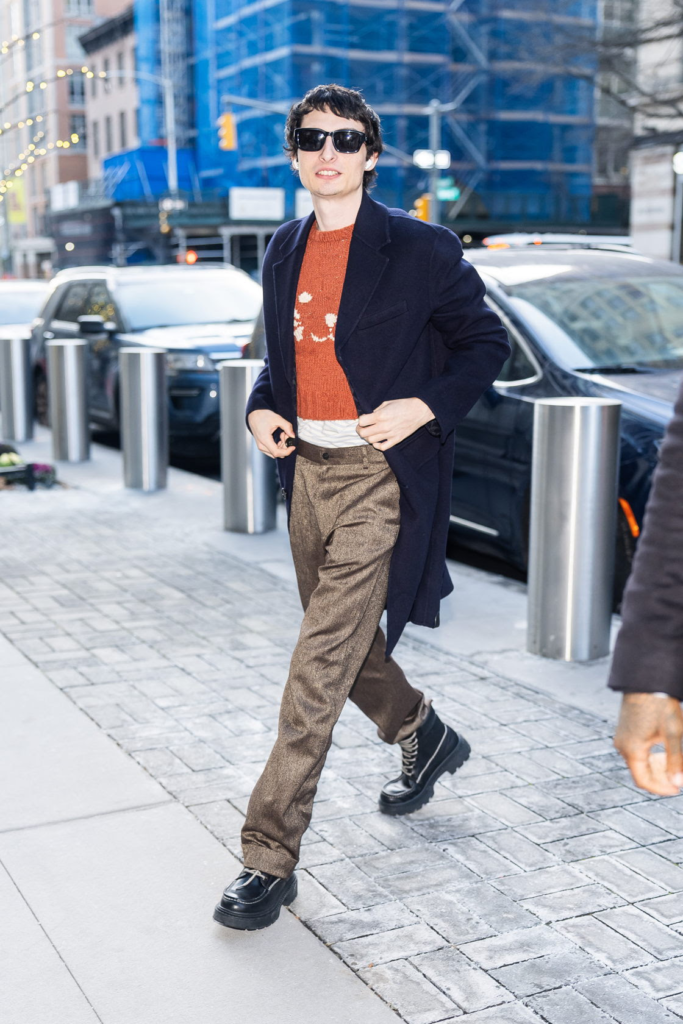 El actor Finn Wolfhard viste un suéter con diseño de silueta animal de la colección Coach Primavera 2026, acompañado de un abrigo de lana doble cara, los lentes de sol Maxi Sculpted C Narrow Square y botas Lug Sole Boot, durante la gira de prensa de Stranger Things.
