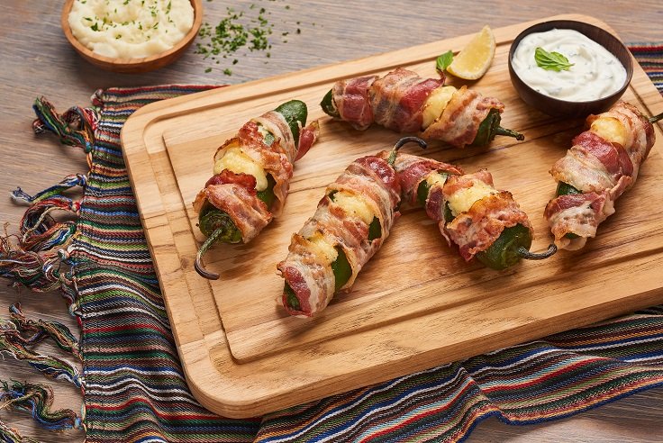 Desvena los chiles; rellénalos con puré y queso manchego, envuélvelos con tocino y hornéalos en una charola a 180°C por 25 minutos.