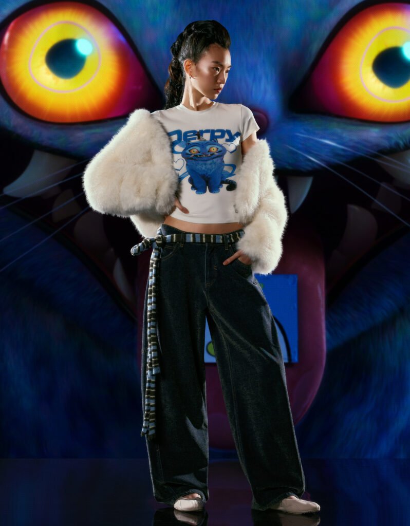 Saja Boys encarna la actitud rebelde con hoodies, camisetas gráficas y denim ancho en una paleta de beige, negro y azul.