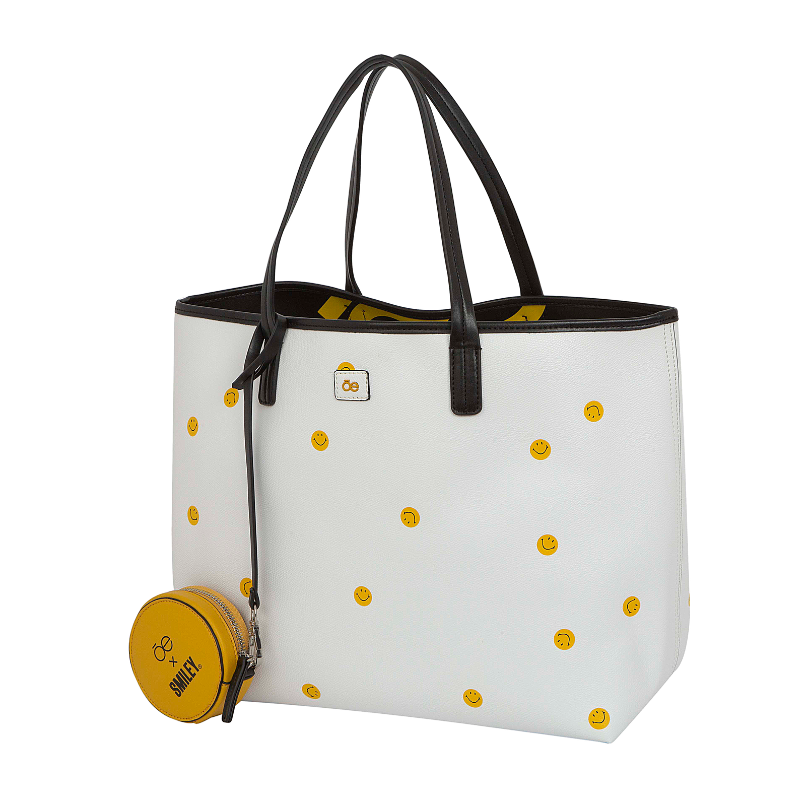 TRES EN UNO: Una de las novedades que CLOE implementa en esta colección, es diseñar un bolso reversible, que te da más opciones de uso, integrando también un monedero dentro del Tote Bag con la finalidad de ofrecer máxima funcionalidad con el look más sonriente del planeta.