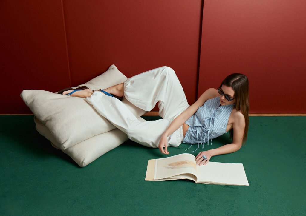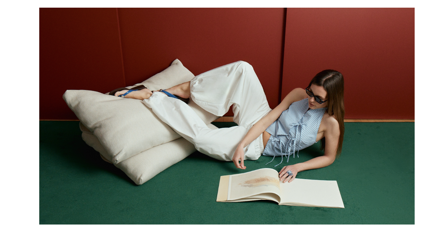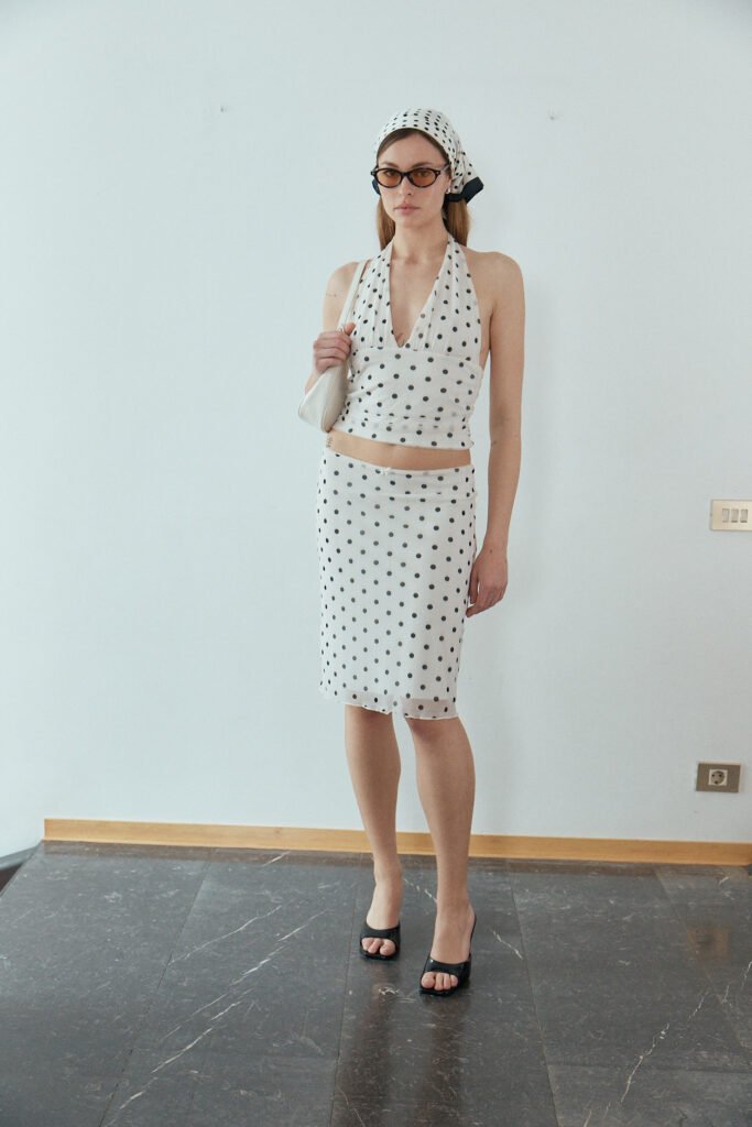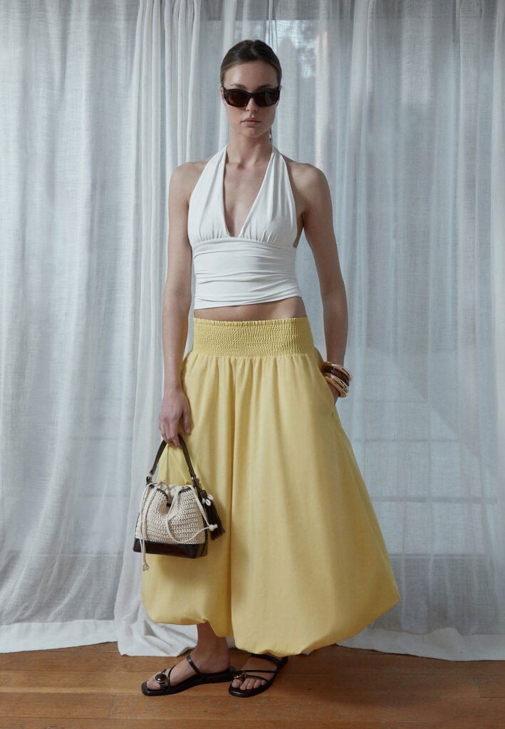 La colección acompaña este concepto con siluetas ligeras y volúmenes definidos. Pantalones balloon, faldas fluidas y denim relajado se combinan con conjuntos de rayas y tops estructurados, especialmente en cortes halter. Tejidos delicados, transparencias sutiles y toques de brillo aportan contraste, mientras blazers y trenchs en tonos neutros reinterpretan el tailoring en clave contemporánea. Bolsos, gafas y pañuelos completan la propuesta versátil y actual.