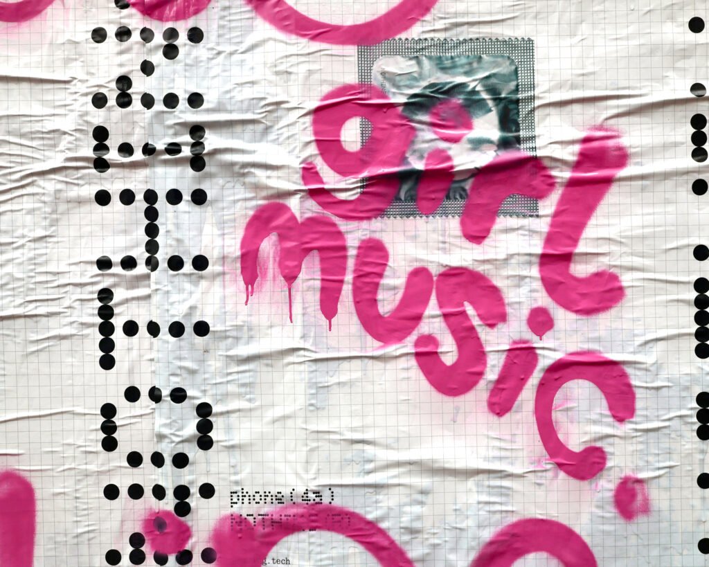 - Intervenciones de graffiti disruptivo sobre flyposters en distintas zonas del centro de Londres, con referencias culturales asociadas al color rosa.