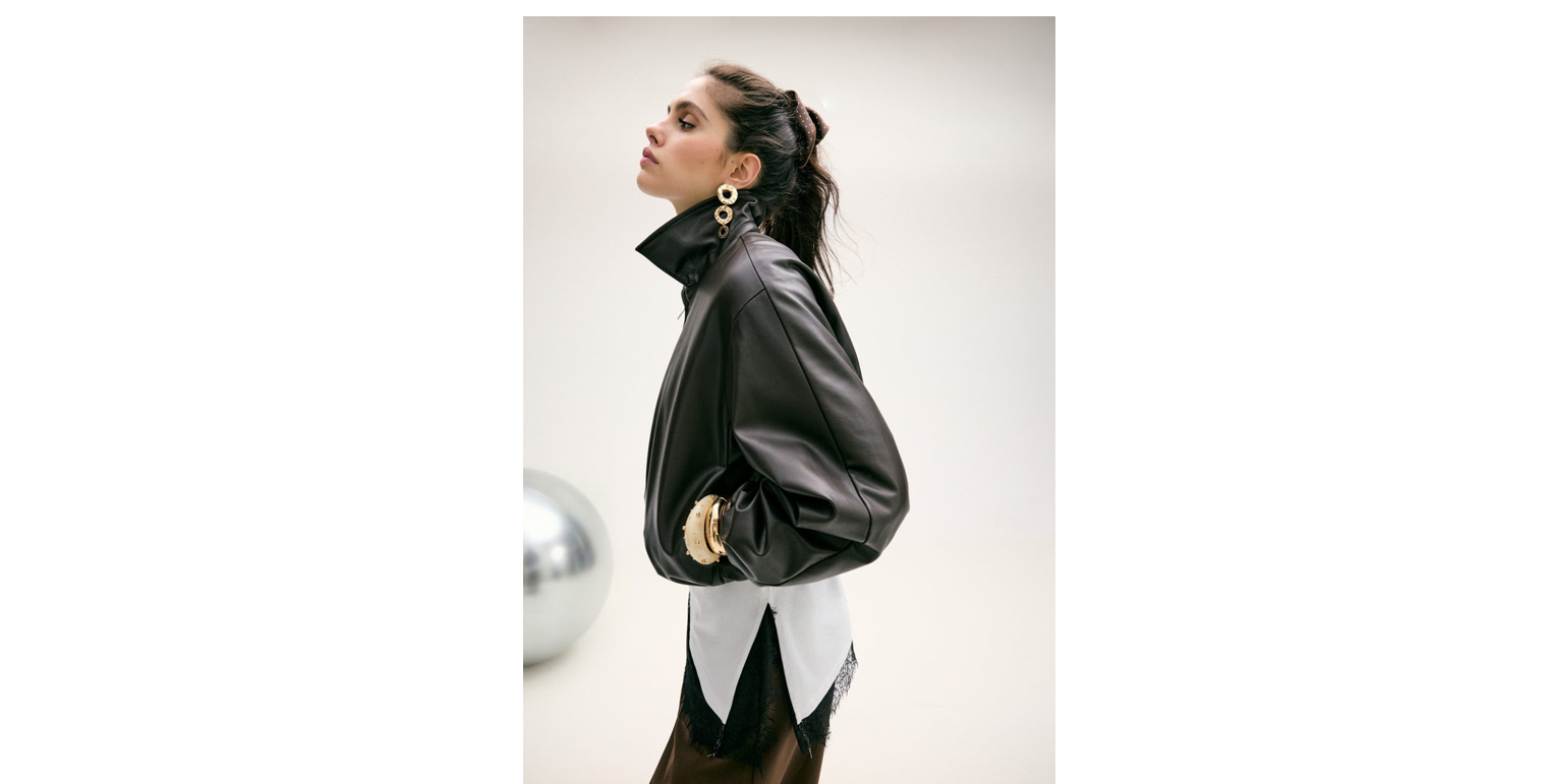 La colección se completa con accesorios que proporcionan más volumen: bolsos de formas suaves y redondeadas, detalles metálicos, brazaletes y maxi gafas potencian el carácter de cada estilismo. Todo converge en una estética donde el volumen no es exceso, sino actitud.