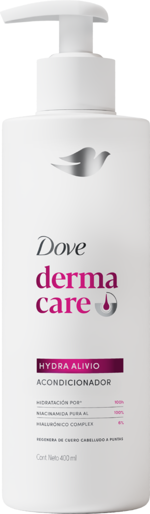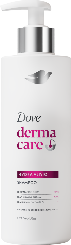 - Dove Derma Care Hydra Alivio, portafolio desarrollado con dermatólogos, contiene hialurónico complex y niacinamida para un cabello suave e hidratado.