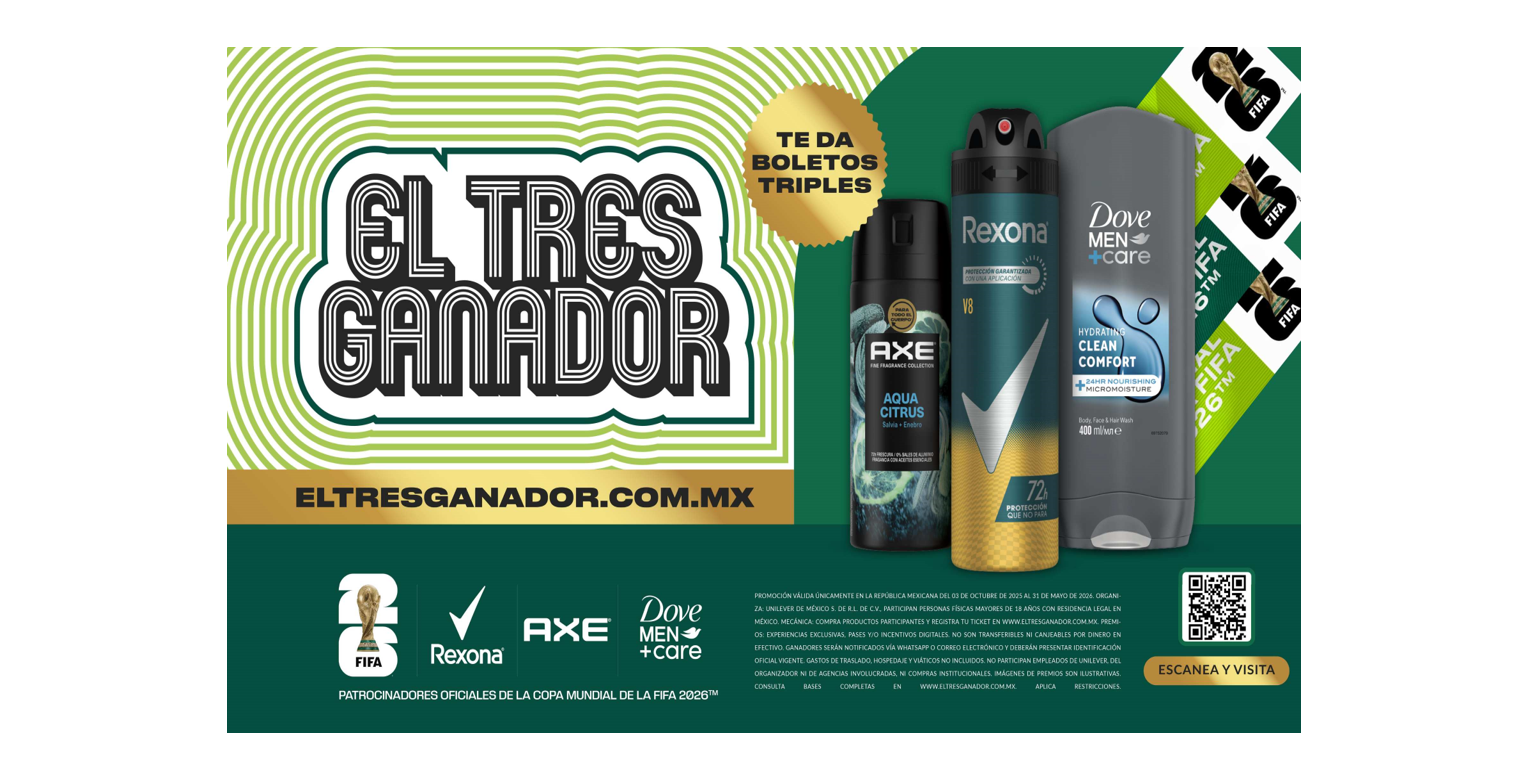 El futbol no se vive, se siente. Y cuando México vuelve a ser anfitrión de la Copa Mundial de la FIFA™ por tercera ocasión, la pasión se triplica. Con ese espíritu, Rexona, Axe y Dove —tres marcas icónicas de Unilever— presentan “El Tres Ganador”, una promoción inédita que regalará 184 pases triples para asistir a los partidos (en México) del torneo más esperado del planeta, además de más de 3,000 premios adicionales.