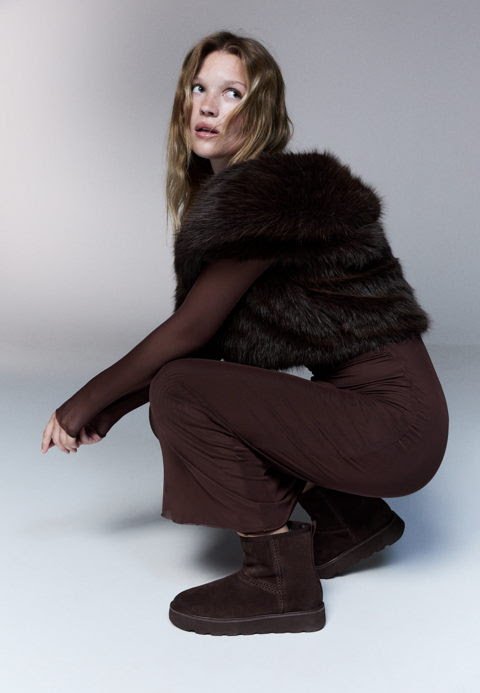 Chaquetas y chalecos de efecto pelo, abrigos largos de paño estructurados, jerséis y cárdigans de punto, maxi bufandas, botas de punta y fluffy hats componen una colección cómoda y estilosa.