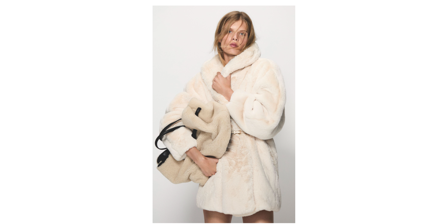 La textura encuentra una nueva expresión a través de los accesorios. La piel de oveja aparece en gorros, guantes y un bolso escultural a juego, introduciendo un sutil contraste y un atractivo táctil. El cuero con efecto cocodrilo continúa durante toda la temporada, cobrando vida a través de formas estructuradas para crear un diálogo de contrastes: suave y estructurado, mate y pulido; que refleja la exploración de la colección en cuanto a fabricación y forma.