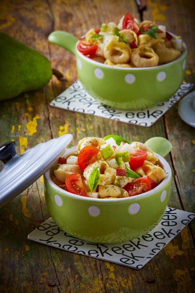 Tortellini con pera, albahaca y cherry